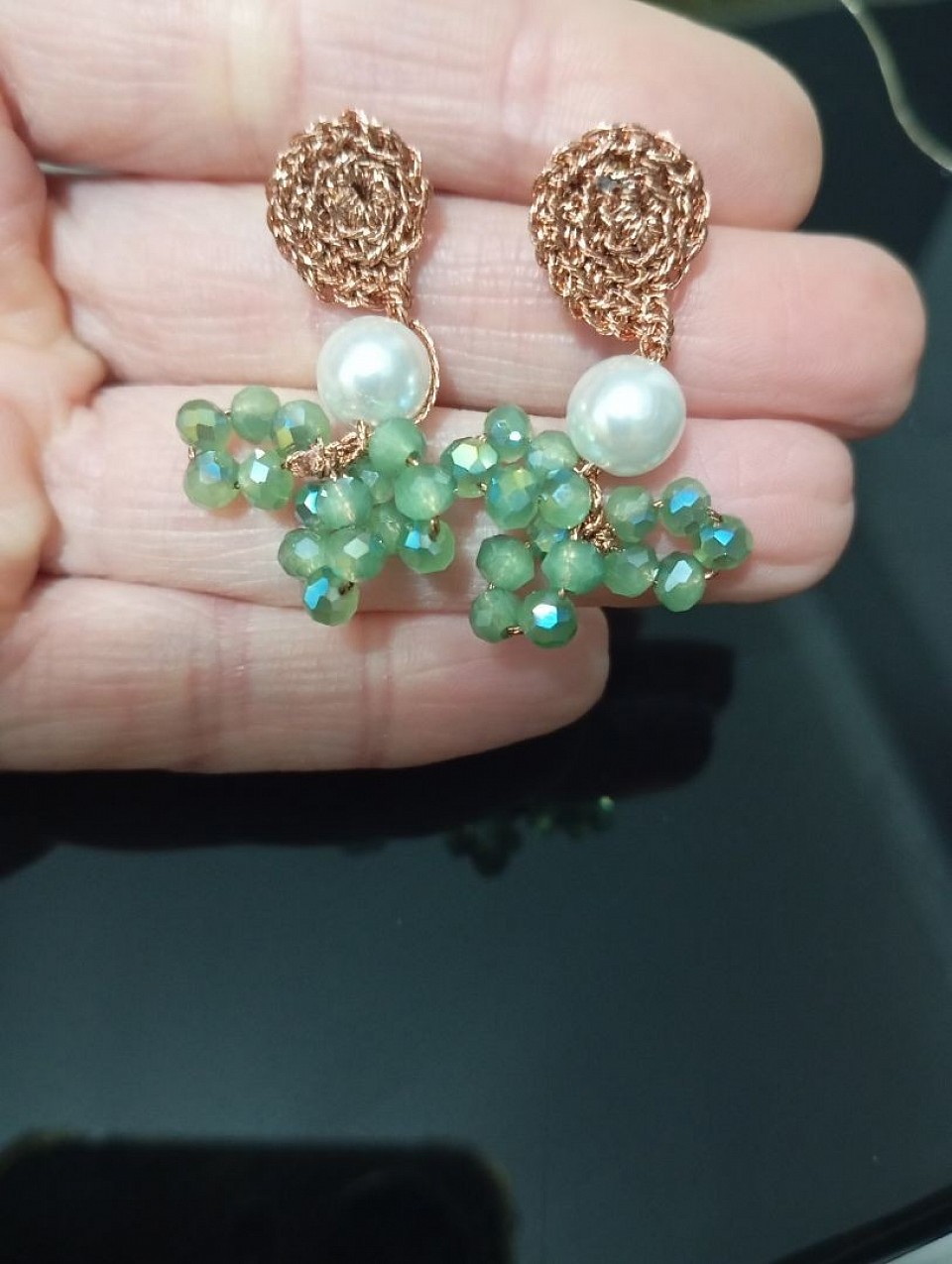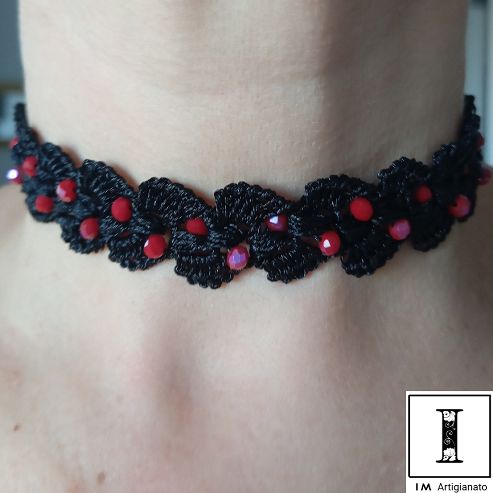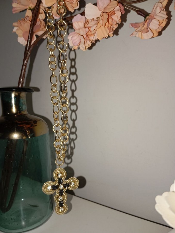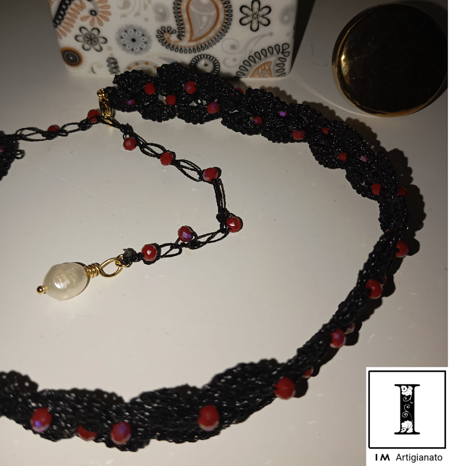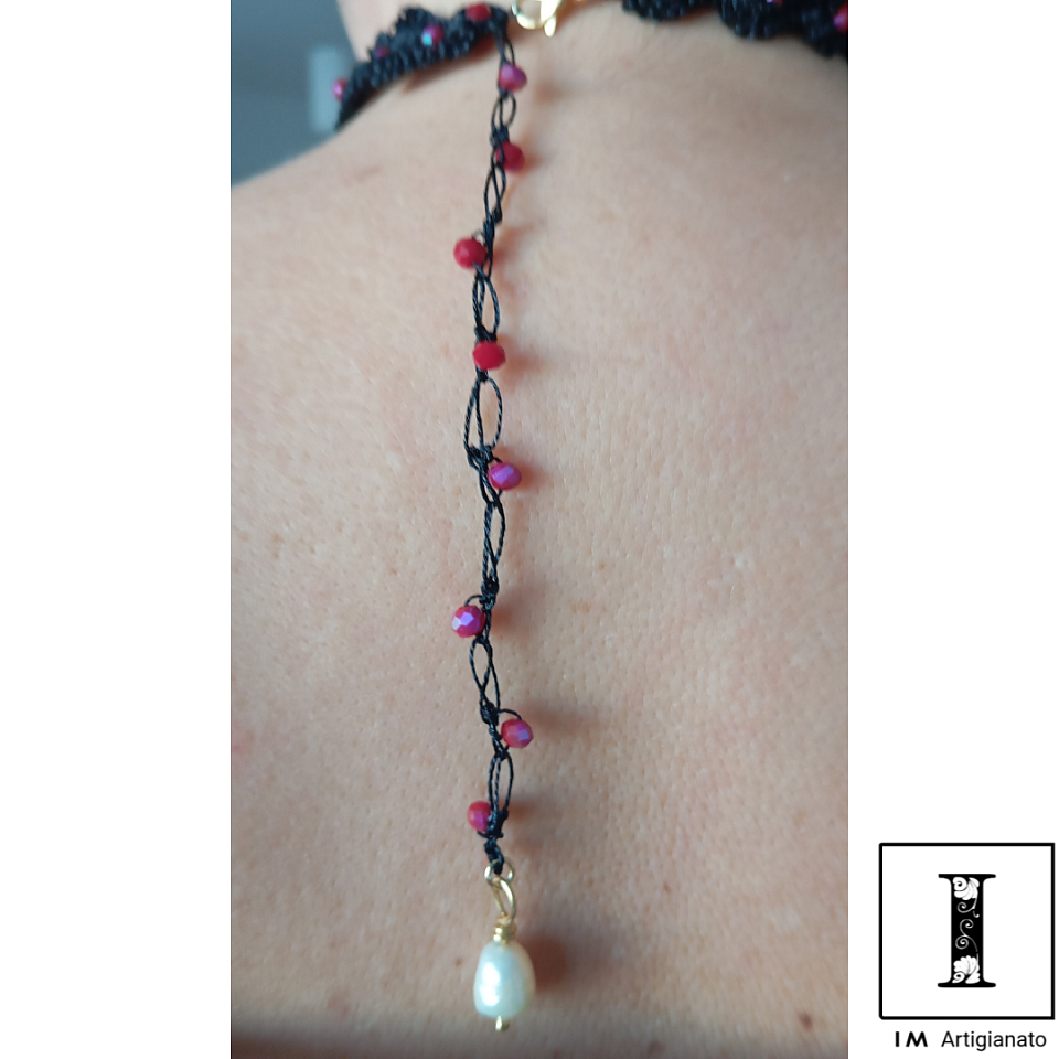 Colore nero, utilizzato 52 cristallini da 4 mm. Con moschettone color oro e finale in perla di fiume con perno da gioielleria.